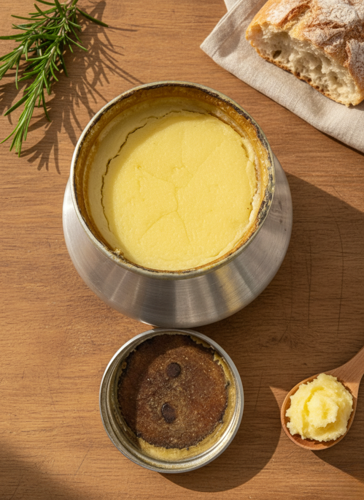 يُستخلص هذا السمن من حليب الغنم الصافي، ويُطهى على نار هادئة حتى يصل إلى اللون الذهبي الغامق، ثم يُبخّر بعناية ليكتسب نكهة معتّقة تُميّزه عن أي نوع آخر.
